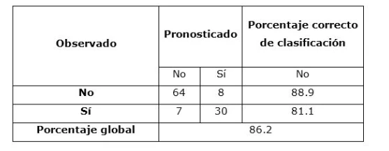 La tabla de clasificación muestra el porcentaje de casos que el modelo clasifica correctamente. Una clasificación global superior al 70-75% se considera aceptable en la mayoría de investigaciones.